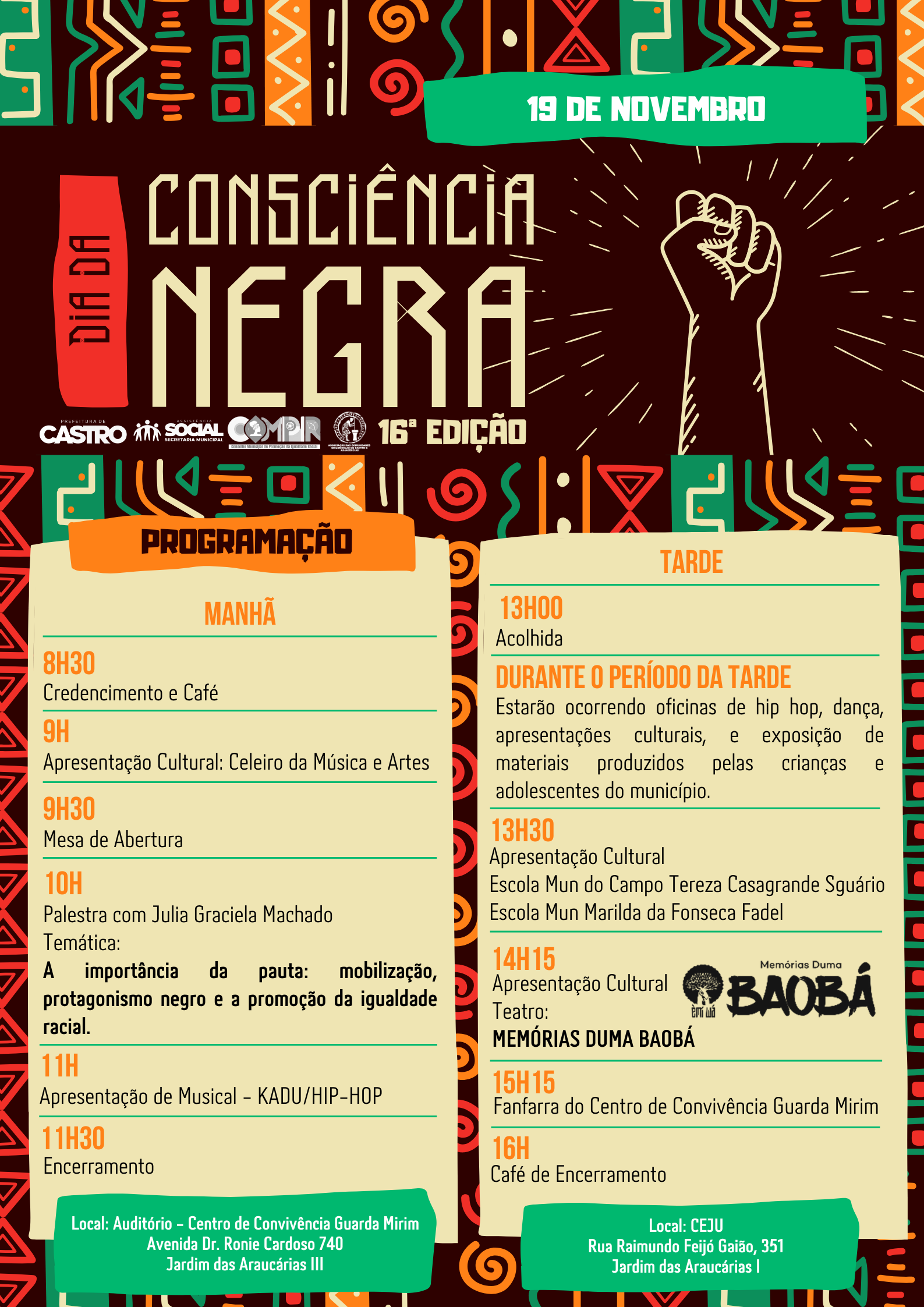 A Secretaria Municipal de Assistência Social, o Conselho Municipal de Promoção da Igualdade Racial (Compir) e a Associação das Comunidades Quilombolas de Castro e Adjacências realizam, na próxima quarta-feira (19), a 16ª edição do Dia da Consciência Negra. O evento reúne apresentações culturais, palestra, oficinas e exposições que reforçam a importância da valorização da cultura afro-brasileira e da promoção da igualdade racial. Toda a comunidade está convidada a participar, e as inscrições podem ser feitas neste link até segunda-feira (17).