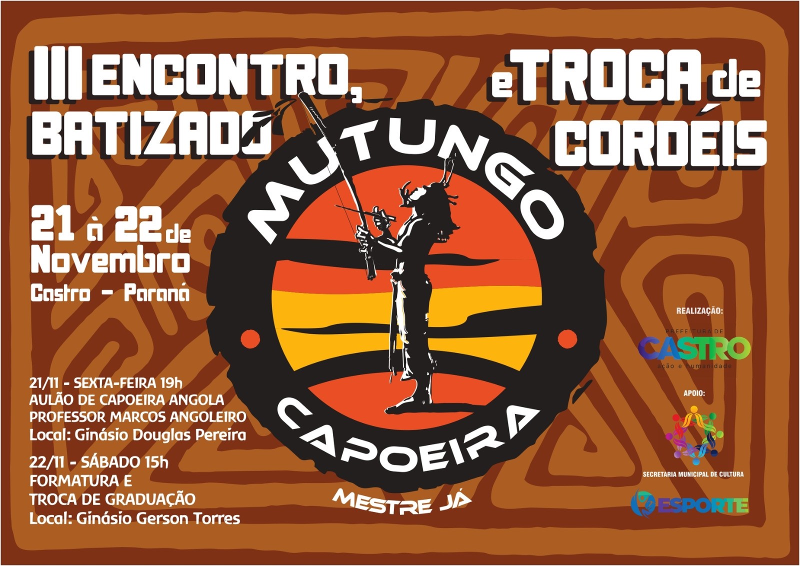 O encontro reforça o papel da capoeira como expressão cultural, educativa e social. A realização conta com apoio da Secretaria Municipal de Cultura, Secretaria de Esporte e Prefeitura Municipal de Castro, fortalecendo ações que valorizam as manifestações culturais locais, o esporte e a formação cidadã por meio da capoeira.