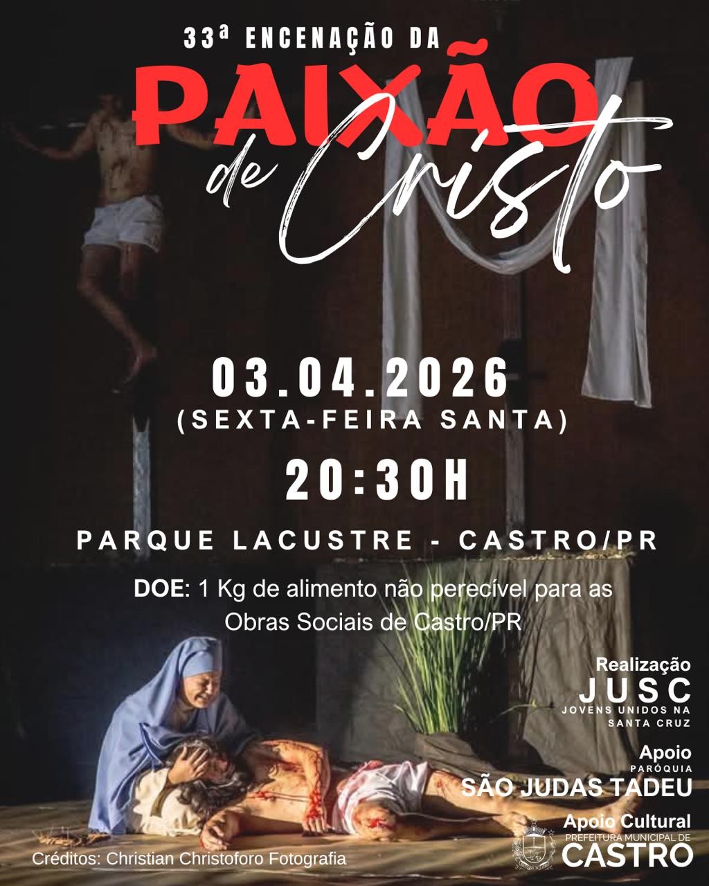 A tradicional Encenação da Paixão de Cristo chega à sua 33ª edição em Castro e será apresentada nesta Sexta-Feira Santa, às 20h30, no Parque Lacustre, reunindo cerca de 100 voluntários em um espetáculo gratuito que retrata a vida, morte e ressurreição de Jesus Cristo como uma das maiores manifestações de fé e cultura da cidade.