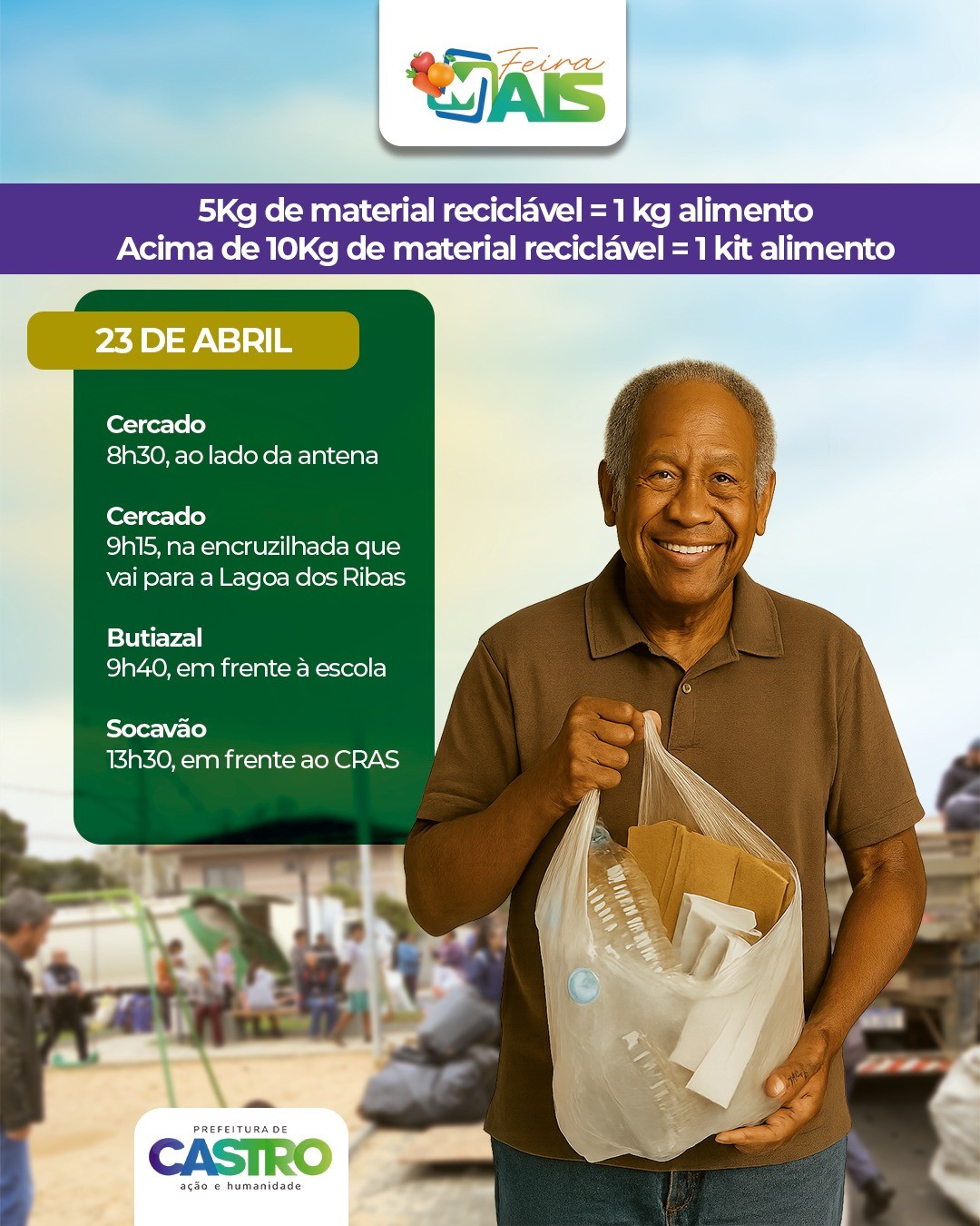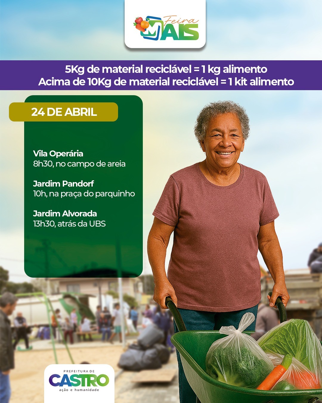 O programa Feira Mais retoma em Castro com atendimento ampliado, fortalecendo a troca de recicláveis por alimentos frescos e promovendo sustentabilidade, renda e segurança alimentar.