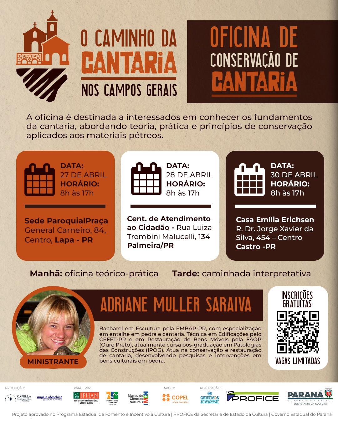 A oficina terá duração de 8 horas e será ministrada pela escultora Adriane Muller Saraiva, bacharel em Escultura pela EMBAP-PR, com especialização em cantaria e atuação na área de conservação e restauração de bens culturais em pedra.