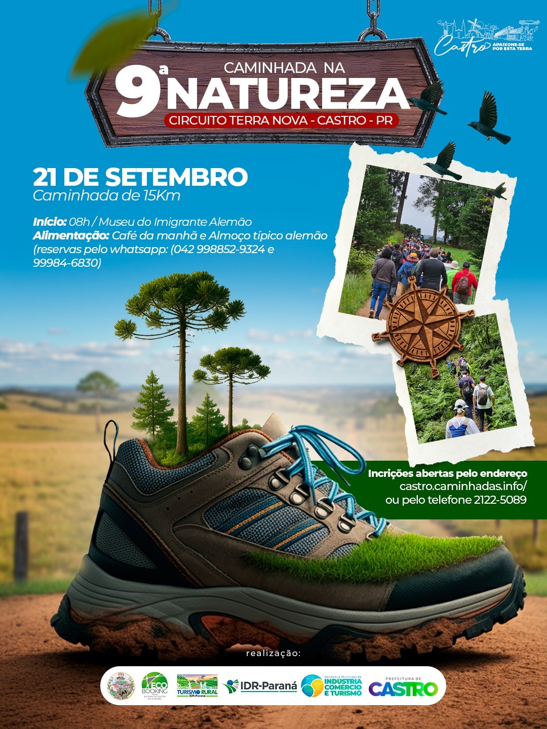 A caminhada é aberta para toda a população de Castro e região, com concentração às 8 horas no Museu do Imigrante Alemão e percurso que deve durar das 9 às 13 horas. Quem quiser, pode aproveitar o café da manhã (R$ 30) e o almoço típico alemão (R$ 50), servidos pela Associação Cultural de Preservação da Ecologia e História de Terra Nova (ACPHETEN). É preciso agendar e pagar antecipadamente pelo (42) 98852-9324, com Angelita, ou pelo (42) 99984-6830, com Giselle. No local também haverá barraquinhas com lanches e guloseimas.