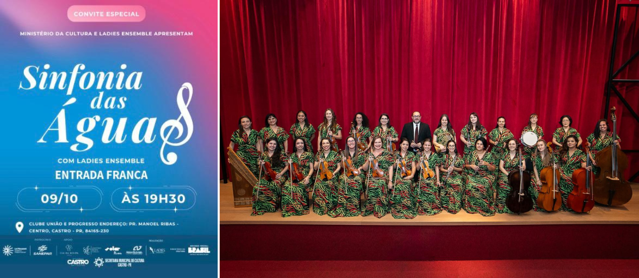 No dia 9 de outubro, o grupo feminino Ladies Ensemble apresenta o espetáculo “Sinfonia das Águas” no Clube União e Progresso, em Castro, com entrada gratuita, como parte da programação cultural da Semana de Castro.