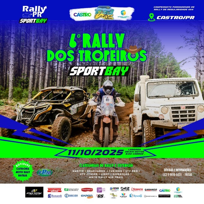 Prepare-se para acelerar o coração e levantar poeira! No dia 11 de outubro, a cidade de Castro (PR) será palco de mais uma eletrizante etapa do Rally PR Sportbay 2025, integrando a programação oficial da Semana de Castro. Esta prova corresponde ao tradicional 6º Rally dos Tropeiros e é válida pelo Campeonato Paranaense de Regularidade 4×4 e UTV.