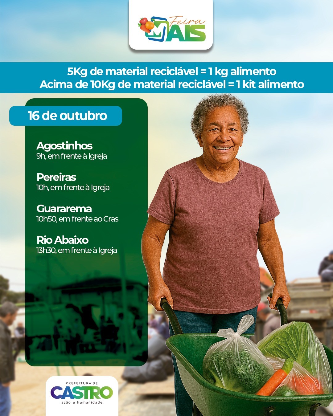 A programação de outubro do Feira Mais vai atender moradores de oito localidades urbanas e rurais de Castro em dois dias de atividades. O programa, que permite a troca de materiais recicláveis por produtos da agricultura familiar, terá paradas nos dias 16 e 17 de outubro, contemplando as comunidades de Agostinhos, Pereiras, Guararema, Rio Abaixo, Escola Dr. Jahyr Lopes, Vila Operária, Jardim Pandorff e Jardim Alvorada.
