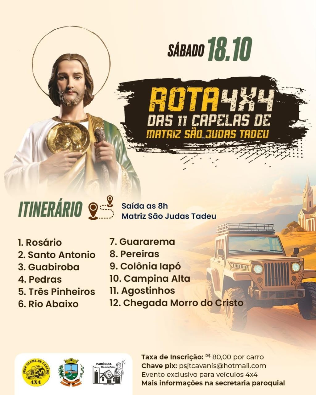 De acordo com Marcos Bertolini, presidente do Jeep Clube, o evento é exclusivo para veículos 4x4, e a inscrição tem o valor de R$ 80 por carro. Mais informações podem ser obtidas diretamente na Secretaria Paroquial da Matriz São Judas Tadeu. “Aguardamos a participação de 60 jipeiros nessa rota especial, que vai ter aproximadamente 135 quilômetros de percurso. A comunidade está convidada a acompanhar a largada e a chegada, porque é uma festa familiar, que une esporte, turismo e fé”, afirma.