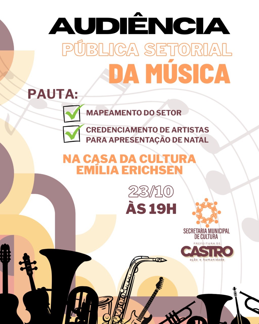 A Secretaria de Cultura de Castro realizará uma audiência pública nesta quinta-feira (23), às 19h, na Casa da Cultura Emília Erichsen, para mapear o setor musical local e discutir a contratação de músicos da cidade para as apresentações de Natal.