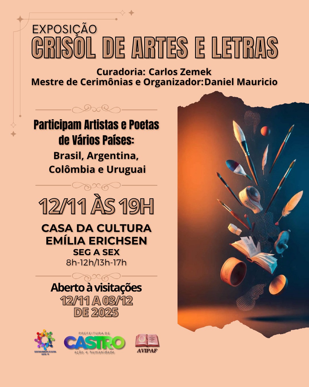 A Secretaria Municipal de Cultura, com apoio da Prefeitura de Castro recebe na Casa da Cultura Emilia Erichsen, no dia 12 de novembro, às 19 h, a abertura da exposição “Crisol de Artes e Letras”, um evento que celebra a união entre literatura e artes plásticas. Com curadoria de Carlos Zemek e organização do mestre de cerimônias Daniel Maurício, o encontro promete uma noite marcada pela sensibilidade artística e pelo intercâmbio cultural.
