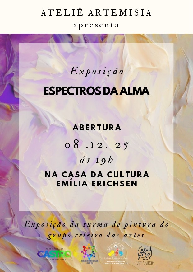 A Casa da Cultura Emília Erichsen abre suas portas hoje, 8 de dezembro, às 19h, para a exposição Espectros da Alma, apresentada pelo Ateliê Artemísia. A mostra reúne obras produzidas por 15 alunos, com idades entre 6 e 50 anos, integrantes da turma de pintura do grupo Celeiro das Artes, e convida o público a mergulhar em uma experiência sensorial que explora emoções, memórias e profundidades internas.