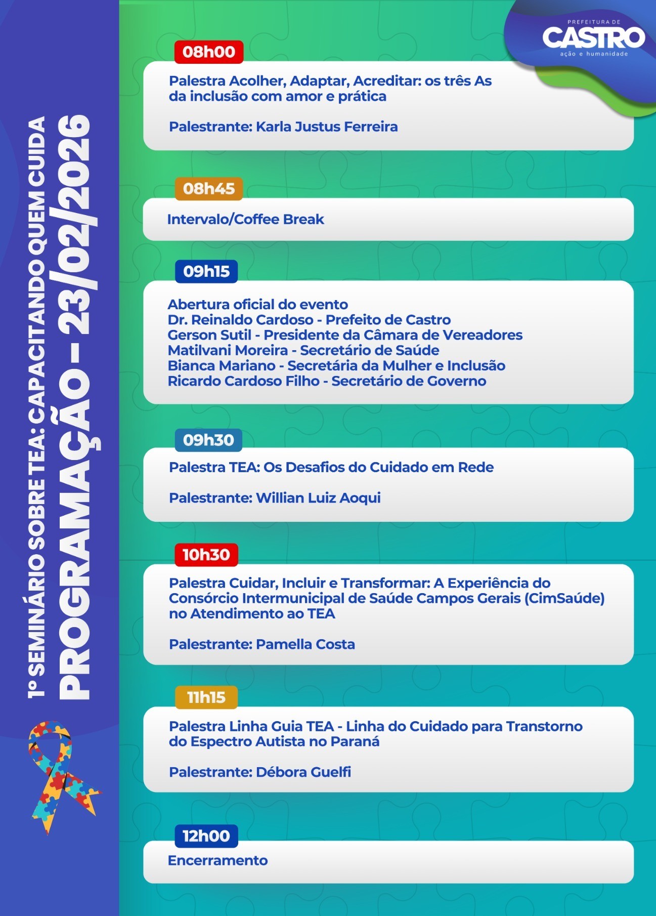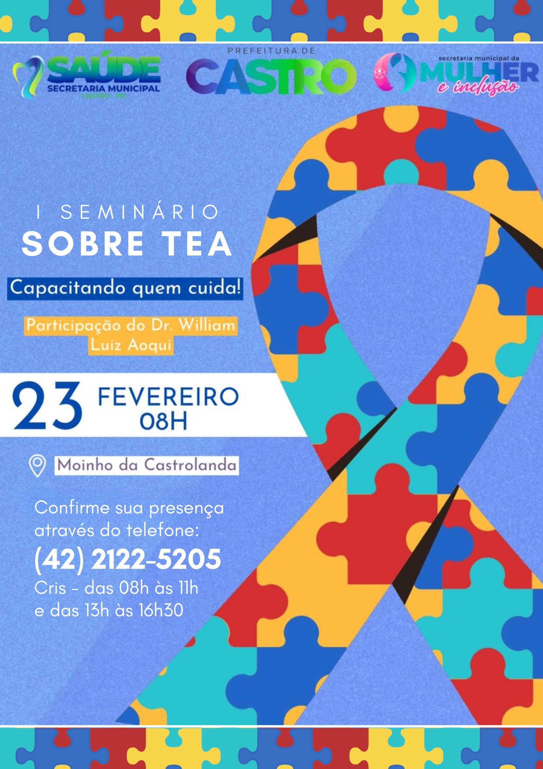 Castro promove, na próxima segunda-feira (23), o 1º Seminário sobre Transtorno do Espectro Autista (TEA). O evento é realizado em parceria pelas secretarias municipais de Saúde e da Mulher e Inclusão.