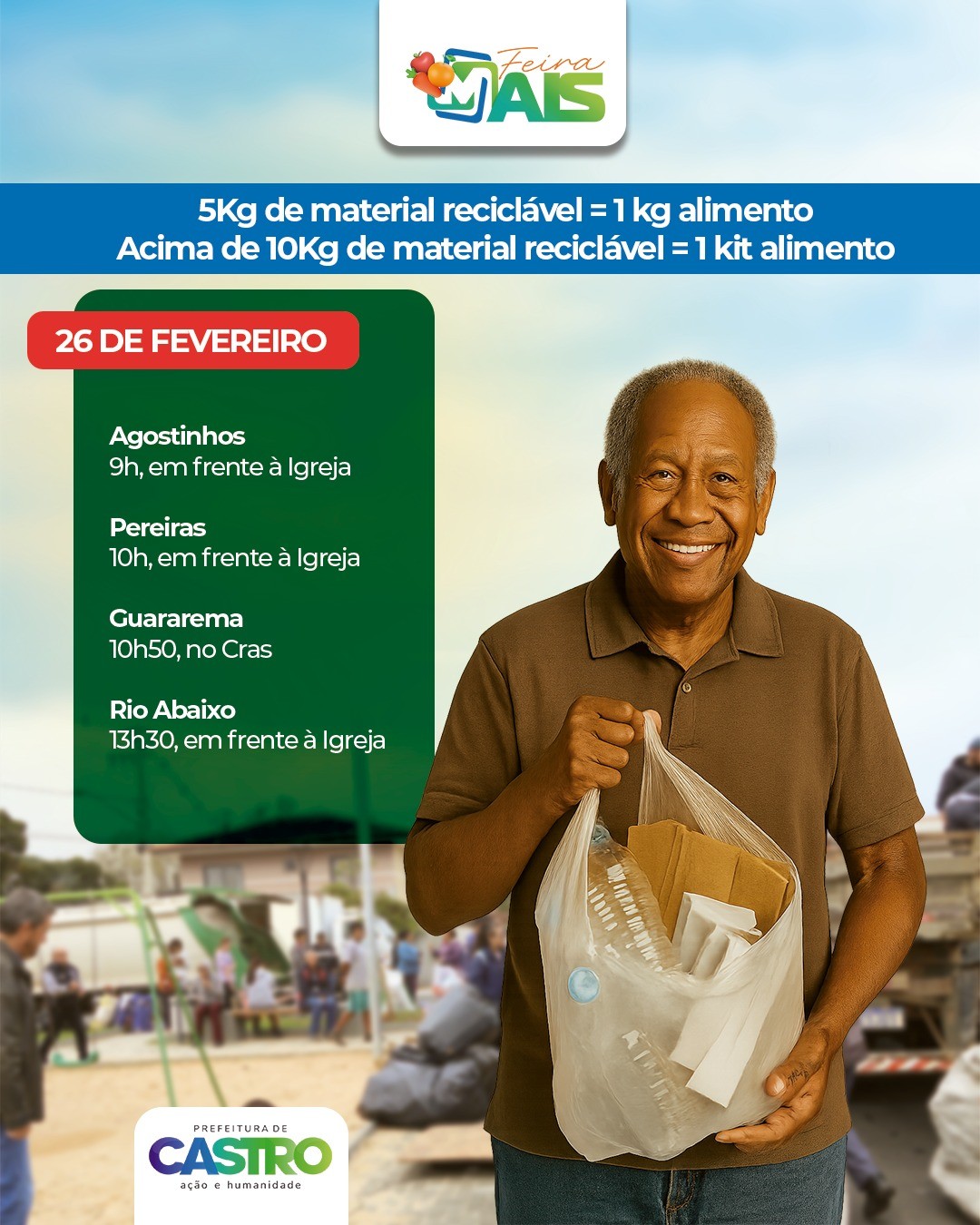O programa Feira Mais terá sua segunda ação do ano na próxima quinta e sexta-feira, dias 26 e 27, com atendimento em sete comunidades da cidade e do interior de Castro. Desta vez, os caminhões da Secretaria Municipal de Agricultura que promovem a troca de materiais recicláveis por alimentos produzidos por agricultores familiares vão passar pelas localidades de Agostinhos, Pereiras, Guararema, Rio Abaixo, Vila do Rosário, Colônia Santa Leopoldina e Jardim Primavera.