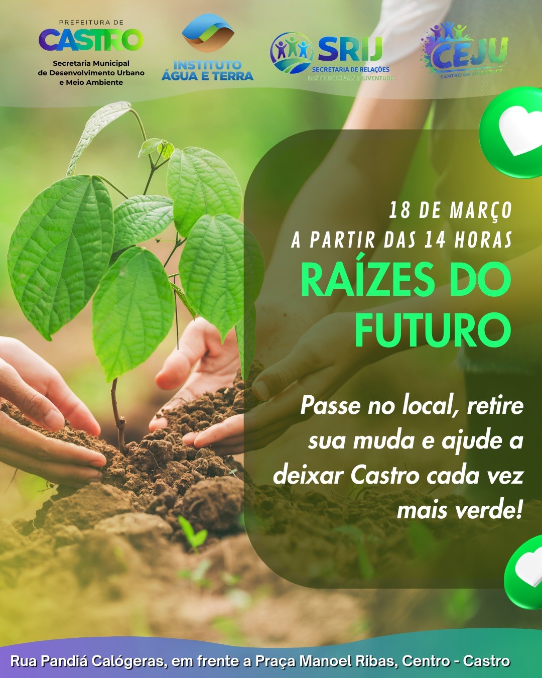O projeto Raízes do Futuro promoverá no dia 18 de março, na Praça Manoel Ribas em Castro, a distribuição gratuita de 2 mil mudas de árvores nativas, incentivando a conscientização ambiental, o protagonismo juvenil e o cuidado coletivo com a cidade.