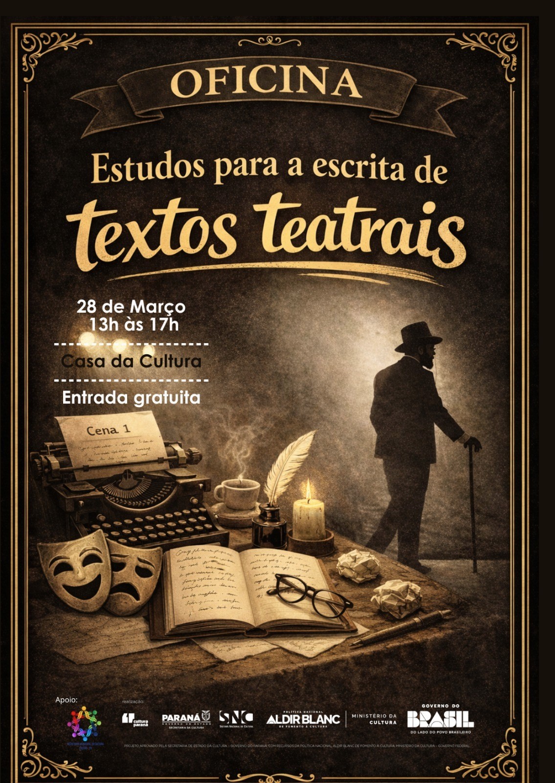 A Secretaria de Cultura, com apoio da Prefeitura Municipal, promove no dia 28 de março a oficina “Estudos para a Escrita de Textos Teatrais”, que será realizada das 13 h às 17 h, na Casa da Cultura. A atividade é gratuita e aberta ao público.
