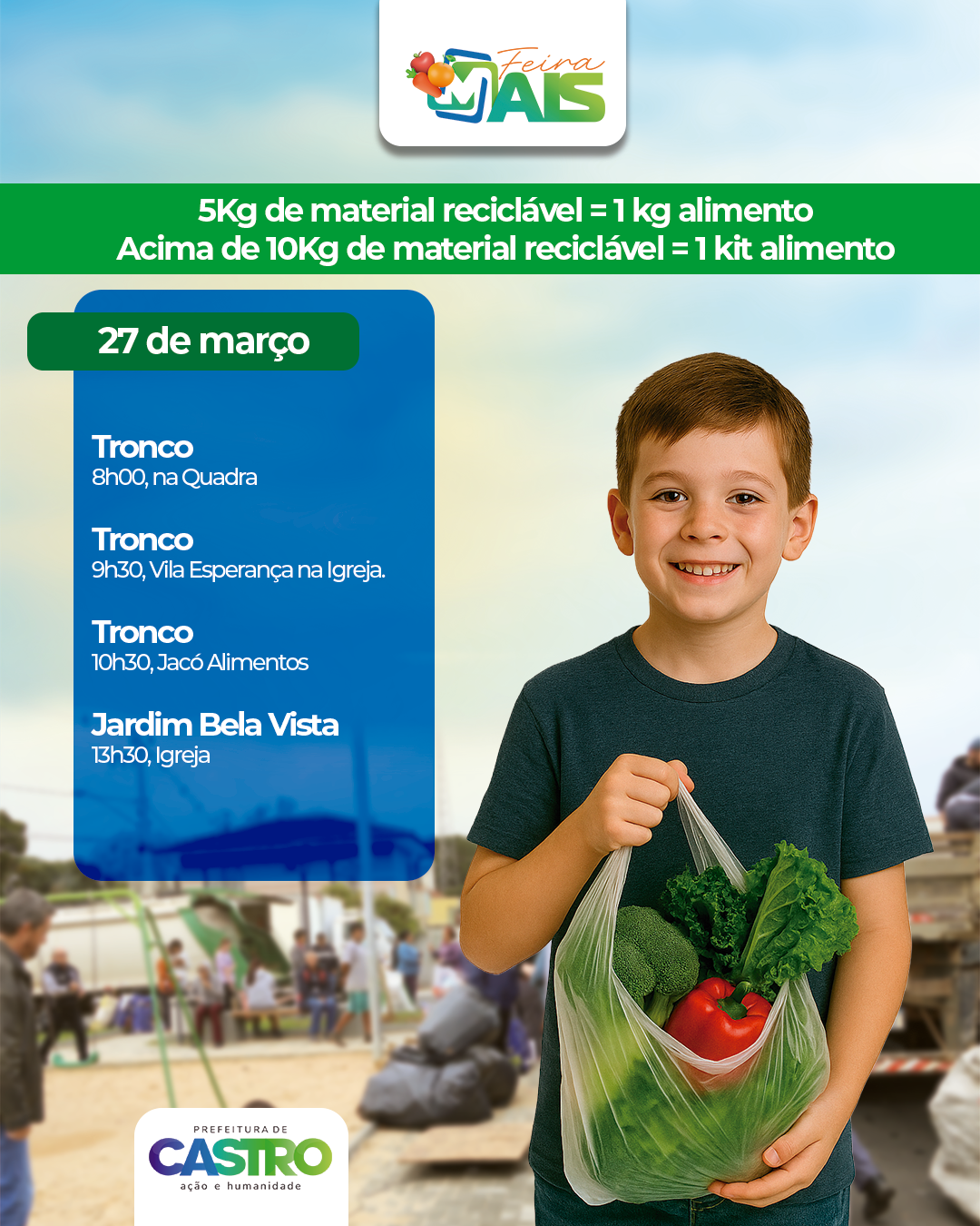 Nesta semana tem ação do programa Feira Mais em Castro, levando a troca de materiais recicláveis por alimentos frescos para comunidades da cidade e do interior. A iniciativa da Secretaria Municipal de Agricultura vai percorrer oito localidades nesta quinta (26) e sexta-feira (27).